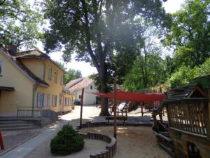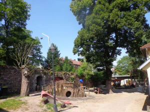 Unsere Kindertagesstätte ist in 3 Gehminuten vom Eisenacher Zentrum aus zu erreichen. In unserem denkmalgeschützten Gebäude, dem neu errichteten Haus und dem großen Außengelände gibt es viel Freiraum und bestmögliche Entwicklungschancen für unsere betreuten Kinder.